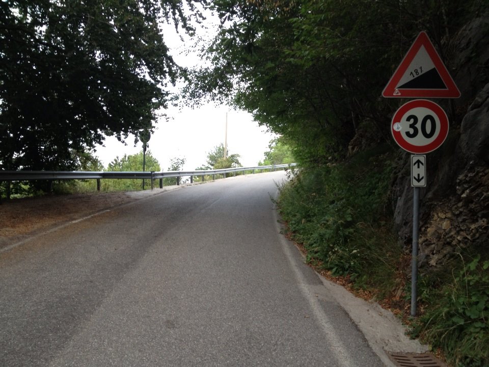 I primi 3 km e 200 mt sono l’antipasto, costanti tra il 7 ed il 10% di pendenza, a questo punto però si incontra un innocuo cartello con limite di velocità a 30 km/h, magari penso …. Peccato che sopra questo, un secondo cartello ci preannuncia tratti di strada con pendenze al 18%! Bene, eccoci arrivati alla “vera” Valcava!