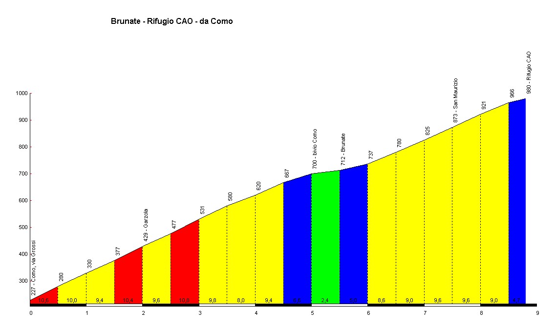 Sono 5km e mezzo costanti tra il 9 ed il 10% di pendenza, non ci sono lunghissimi rettilinei, la salita si snoda tra la periferia di Como, l’attraversamento della frazione di Garzola e l’arrivo in Brunate.