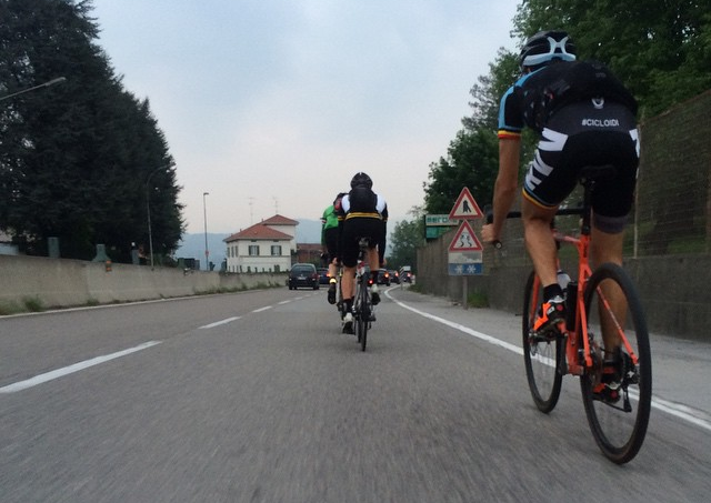 Appena fuori la città viene impresso al gruppo un ritmo da pazzi! Fortuna che me la cavo alla grande a ciucciare ruote. Anche se al primo cavalcavia salterò in aria come un petardo, rimango in scia per godermi la libidine di pedalare a certe velocità!