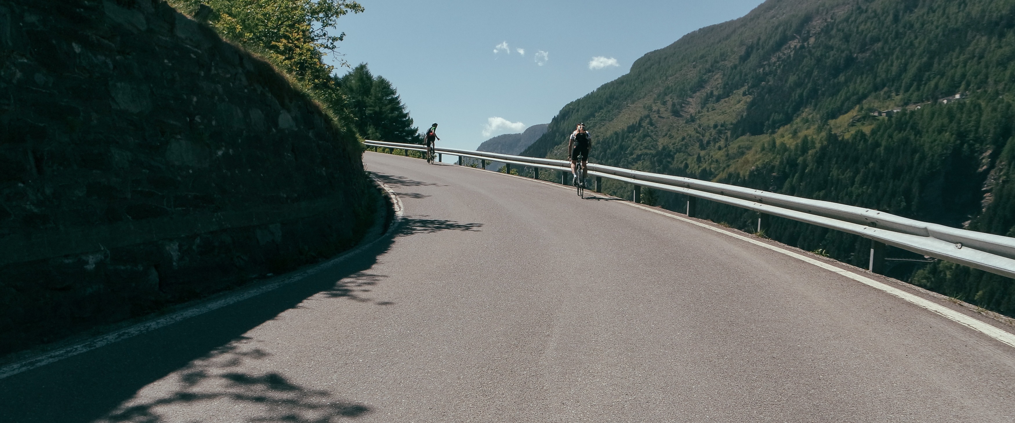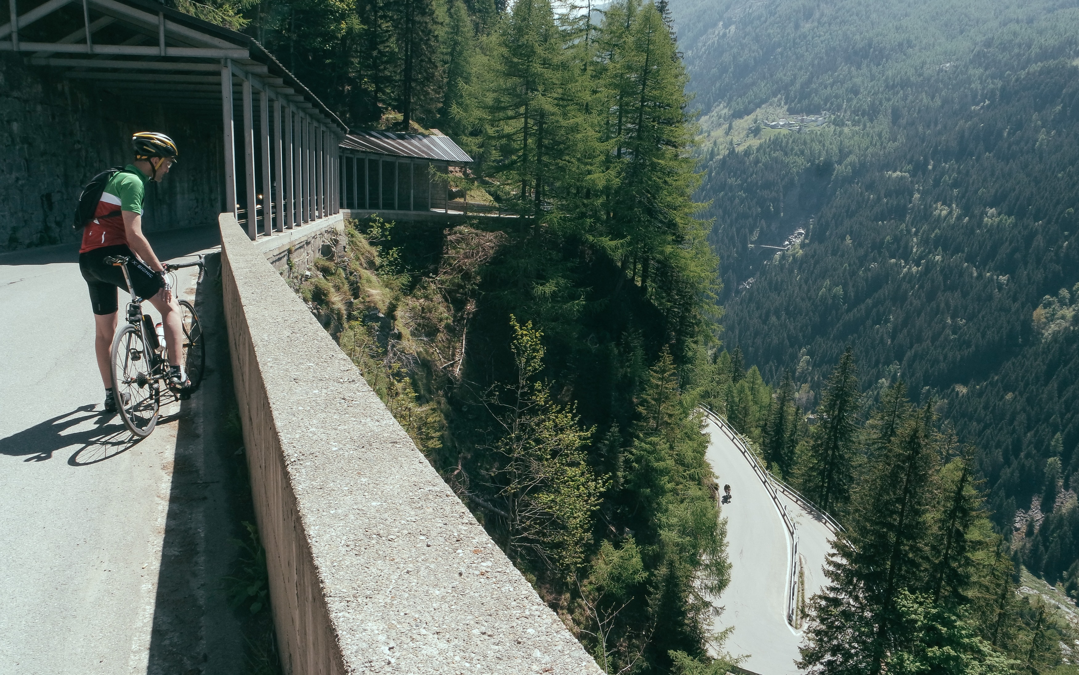 Qui pedaliamo per un paio di chilometri in piano, anche con tratti in discesa, l’ideale per ricaricarci il giusto prima di affrontare gli spettacolari “cavatappi” di tornanti aggrappati al costone della roccia che ci porta al bivio per Madesimo. Questo tratto lo reputo, a mio modo di vedere, l’essenza dello Spluga. È incredibile come questa strada sia stata tra le più importati vie di collegamento tra Italia e resto d’Europa sino a qualche decennio fa, ed ancora più incredibile il fatto che questi 10 tornanti erano affrontati da qualsiasi tipo di autocarro creando, immagino, non pochi problemi di viabilità sia sui tornanti che nelle strette gallerie. Solo negli ultimi anni è stata aperta una variate per i mezzi pesanti che bypassa l’intero tratto del “cavatappi”. Noi chiaramente si sale per la vecchia strada, l’originale.