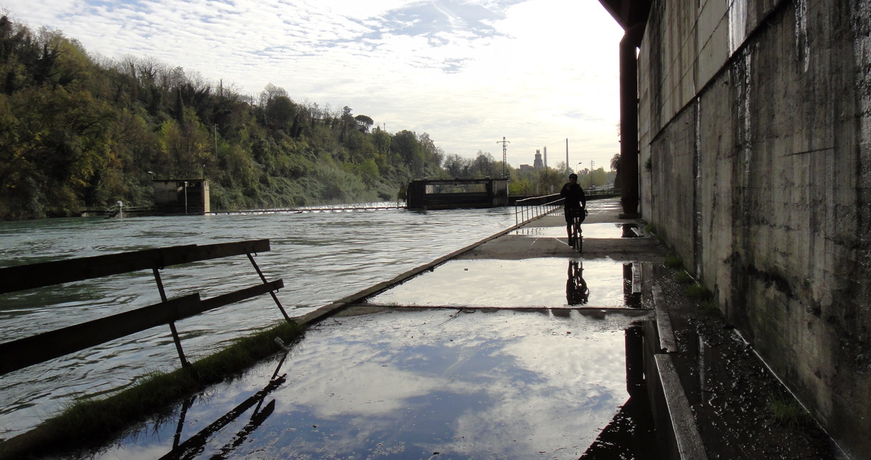 Oltre agli improbabili detriti da evitare sul fondo del canale, anche i passaggi sotto le varie arterie, soprattutto Tangenziali e Autostrade, non sono certo semplici da affrontare, le altezze tra i viadotti ed il bacino sono veramente minime, per evitare di incastrarsi sotto, siamo costretti a pedalare ripiegati sul fianco della bici, come dei veri funamboli delle due ruote!