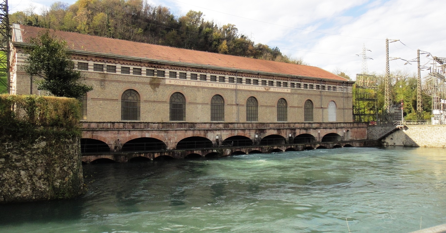 Dopo aver ricevuto preziose indicazioni dai gestori del Bar, riprendiamo la strada in direzione del Santuario della Divina Maternità nel comune di Trezzo, sito sul ciglio dell’Adda in prossimità del punto dove nasce il Naviglio Martesana, e da dove, finalmente, è possibile imboccare la ciclabile in direzione di Lecco. Qui, a mio parere, inizia il tratto più spettacolare, il Fiume, a pochi centimetri dalle nostre ruote, ancora gonfio delle piogge cadute in questi ultimi giorni, è davvero maestoso. Il percorso, disegnato al meglio e facile da percorrere anche per i bambini, è ricco di siti di notevole interesse, oltre a suggestivi angoli della valle dell’Adda, le assolute protagoniste sono le centrali Elettriche sparse per tutto il tragitto, ingegno di altissimo livello messo a disposizione della comunità, uno spettacolo non solo per la loro funzione, ma anche per la loro bellezza architettonica.