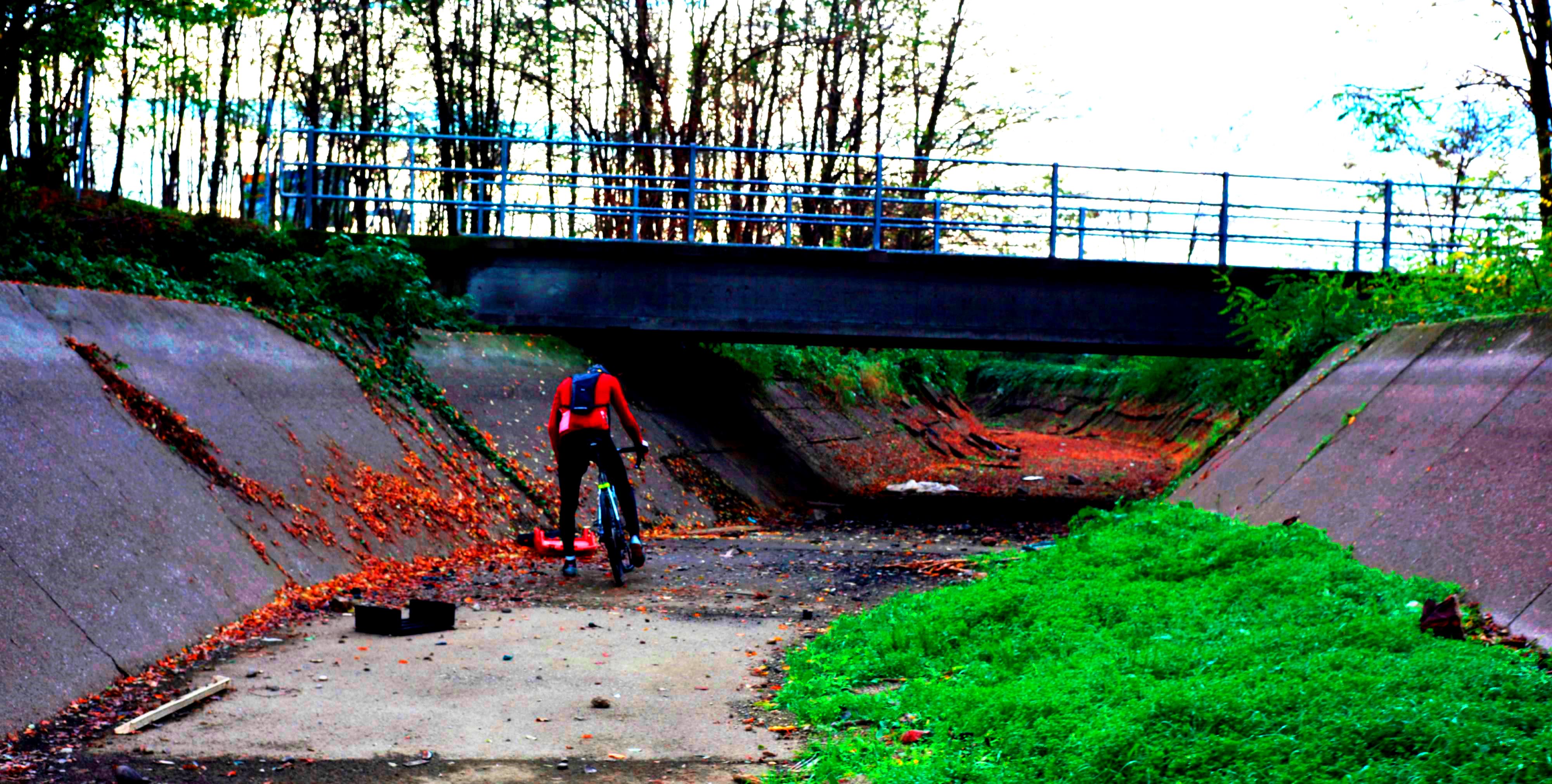 Inutile restare su un argine così brutale, perché non provare a pedalare sul letto? Tanto al massimo rischiamo una foratura, che altro?! Detto fatto, ci caliamo subito e iniziamo a pedalare sul fondo evitando il più possibile ogni tipo di oggetto abbandonato dall’uomo o trascinato dalle acque. Con questo stratagemma abbiamo sì evitato di perderci, ma non abbiamo garantito un tracciato affidabile per chi, un giorno, vorrà pedalare seguendo le nostre orme… vabbè, siamo costretti a ritracciare almeno questo primo pezzo, nel frattempo però, la libidine di pedalare sul letto del Villoresi non ha prezzo!